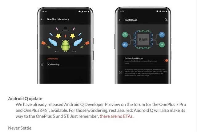 一加官网早前发布公告,表明了一加5/5T/6/6T将用上一加7 Pro上的一些重要功能,包括DC调光等。目前一加6/6T已经支持参加Android Q Beta测试,现在,一加官方又在此宣布,一加7 Pro海外版全面升级Android Q Beta,并且一加5/5T也会迎来更新,但具体更新日期不详。