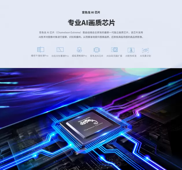王志国表示,“创维在2017年定制了一款拥有足够多算力的芯片,在此基础上赋能图像识别、画质改善、语音处理三大算法。这款芯片带来的不是营销功能上的宣传,而是用眼睛看到这台电视机以后,让人觉得可以抛弃手机和平板电脑,选择这张大屏看电视。这个芯片就是变色龙芯片。”