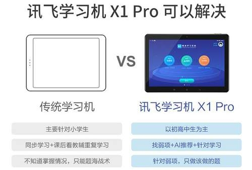 以往,市面上的辅助工具、学习机大多都是教材书的电子版,披着智能的外衣,却仍然是传统填鸭式教学。但是最近上市即爆卖的一款人工智能时代的黑科技产品——科大讯飞学习机X1 Pro,却是一款名副其实的智能AI学习机。不同于市面上的其他学习机,X1 Pro以"每个学生对知识的掌握程度"为核心,通过"找弱项—AI推荐—针对学"的路径引导,为学生们提供"私人订制"的辅导方案,助力初高中学生更快消灭弱项,提高学习成绩。