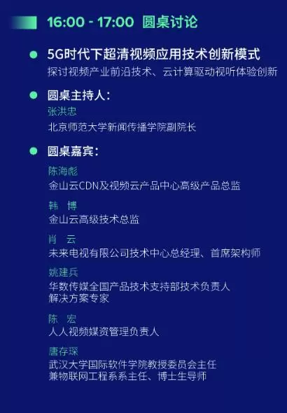 在主题为“5G时代下超清视频应用技术创新模式”论坛的圆桌讨论环节,各位演讲嘉宾将共同探讨视频产业前沿技术、云计算驱动视听体验创新,带给大家更多维度的思考和启迪。
