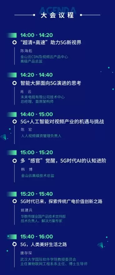 5G会给通信行业带来巨大的变革,网络高速化、视频高清化将会随着5G商用落地步入千家万户。金山云CDN及视频云产品中心高级产品总监陈海彪将发表《“超清+高速”助力5G新视界》主题演讲,金山云将会深入剖析5G的行业趋势,并针对性提供金山云解决方案,助力客户打造5G新视界。