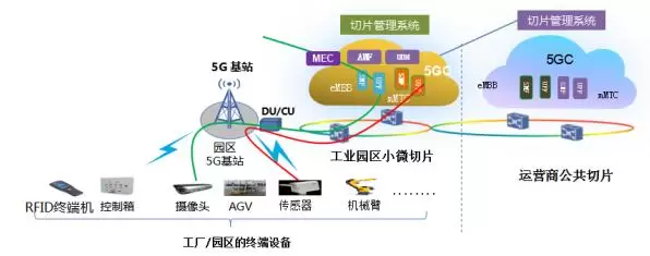 例如封闭场景,在工业园区内部署整个5GC,包含AMF、SMF、UPF、UDM等,同时园区内,可以根据业务需要构建不同的小微切片进行连接,如eMBB场景下的视频监控领域、mMTC场景下的传感器领域、URLLC场景下的柔性制造领域。对于切片管理系统,可以部署在工业园区,企业可自行对切片进行运维,或者部署在运营商数据中心,此时园区切片可由运营商代运维。