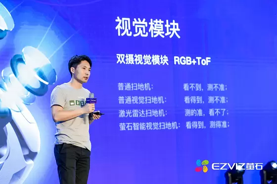 发布会现场呈现的惊喜还不止这些。现场发布了萤石第一代扫地机器人RS1,它除了拥有超大吸力,长续航,高过槛能力等扫地机器人的基础能力,可以高效完成地面清洁任务之外,最大的特点莫过于开了“天眼”——拥有双摄模块,一个RGB摄像头执行视频采集,一个ToF摄像头负责深度感知。