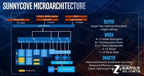 更深方面,Sunny Cove微架构表现在L1容量的增加,从32KB增加到48KB,而且L2缓存、uop、TLB缓存都更大;