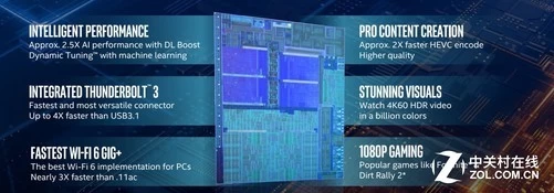 首先来看IceLake平台。全新的10nm IceLake平台在性能表现上借助了AI功能,支持DL Boost、支持Dynamic Tuning机器学习,它能够动态地分配GPU与CPU的负载与功耗,虽然并非10nm平台新技术,但对于IceLake处理器的性能表现有明显的帮助。