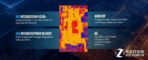 10nm IceLake将PCH封装到一个芯片上,而PCH芯片则由14nm制程工艺打造。集成Wi-Fi 6 GIG+和新的电源管理,整合802.11ax,并能够更好的控制CPU和PCH的能耗和功耗。