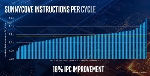 IPC是处理器性能的重要指标。Sunny Cove微架构为10代酷睿带来了18%的IPC性能提升,相对于SkyLake微架构有1.4倍的提升。另外这里需要说明的是,英特尔给出的IPC提升18%数据是通过5个Benchmark测试出来的结果,18%是一个平均下来的水平线。