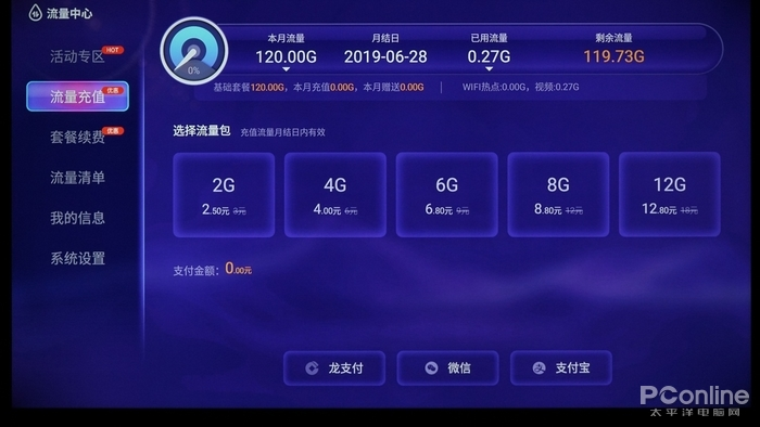 流量中心的入口就在大首页右上角,还是非常方便的,除此之外,也可以通过应用里的流量中心进入。可以看到功能还是很丰富的。在流量中心里可以进行流量充值,套餐续费,流量历史查询,我的信息管理以及系统设置等等。
