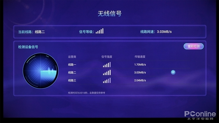 盒子内还自带测网速软件,测试了一下,网速在3M/秒出头,这个网速基本看电视上在线的蓝光,4K影视剧都是非常流畅。