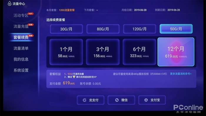 在套餐里这款腾讯极光4G盒子一共提供了四档流量套餐给大家选择。我个人觉得要满足一个月看视频加无线上网的需求还是尽量买50G/月的套餐或者以上。但是值得注意的是,这个续费套餐是包含一年腾讯视频超级影视VIP的。