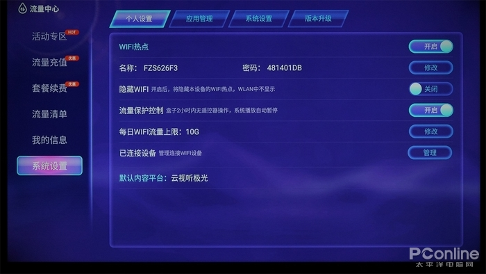 说到wifi,腾讯极光4G盒子厉害的地方就是不仅自带网络,还能开启wifi热点,当做路由器进行使用。在系统设置里可以进行的wifi热点的设置,包括管理wifi名称密码,隐藏wifi热点,流量保护机制,设置每日wifi流量上限以及管理连接wifi设备等。