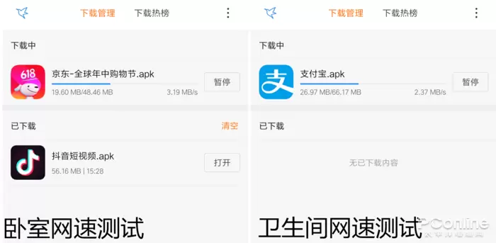 当在不同的空间内就考验腾讯极光4G盒子的网络信号穿墙能力了。在隔了一堵墙的卧室进行测试发现网速基本没有什么变化,也非常稳定。可以看到腾讯极光4G盒子wifi信号穿一堵墙是完全没有问题了。而在卫生间进行测试时,此时隔了两堵墙,距离也有5米以上,可以看到wifi信号确实是衰减了,但是网速依旧能达到2.5M/秒左右,可以看出腾讯极光4G盒子的wifi信号能力还是非常不错,绝对满足日常普通户型家庭使用。