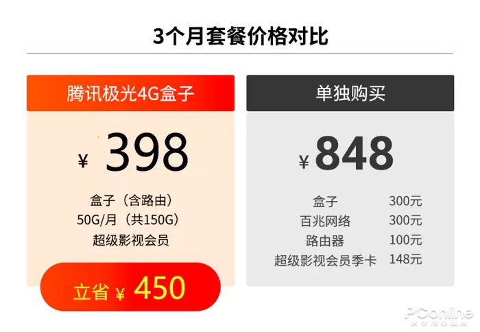 如果在京东购买这个三个月共150G套餐盒子的话,在6月1日00:00至6月5日23:59可以预付1元定金,到6月6日支付尾款,可抵280元,最终到手价是398元。要知道腾讯视频超级影视VIP季卡也要148元了,加上现在手机购买通用流量50G也要156元左右,整体来说现在入手非常划算!