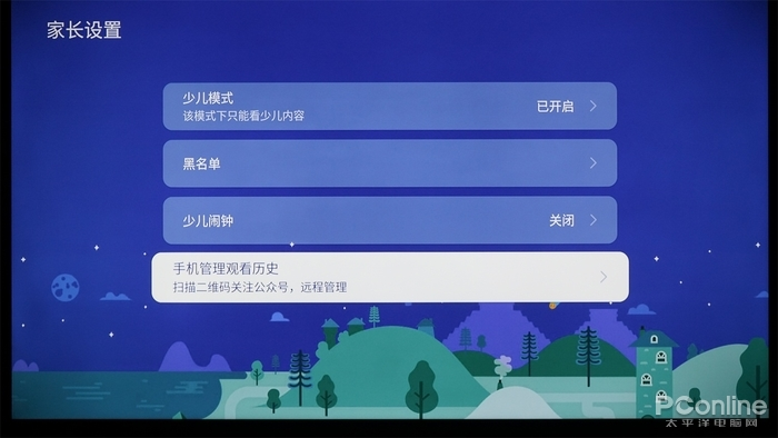 少儿模式下也可以进行家长管理设置,包括设置节目黑名单,设置少儿闹钟,给孩子定一个观看电视的合理时长,以及用手机管理观看历史。