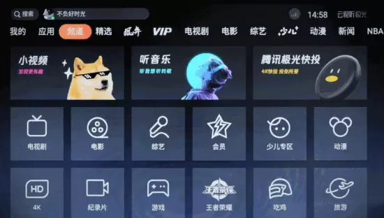 腾讯极光4G盒子的首页UI布局与电视端的腾讯视频基本差不多,采用左右分栏式的布局结构,首页一共包括精选、电视剧、电影、综艺、少儿、动漫、新闻、NBA、纪录片等20多个栏目。内容非常丰富,分类也非常精准。