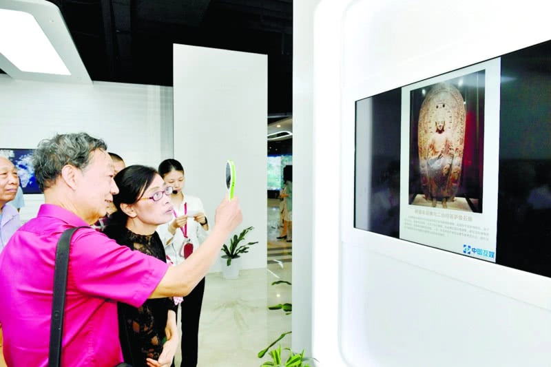 工作人员手持一面巴掌大小的“魔镜”,点开镜面上的“AR博物馆”APP,对着墙上的一幅《千手观音唐卡》画作轻轻一扫,原本静止的画面立刻“活”了起来,悦耳的语音讲解同时响起,生动讲述着画作背后的故事。