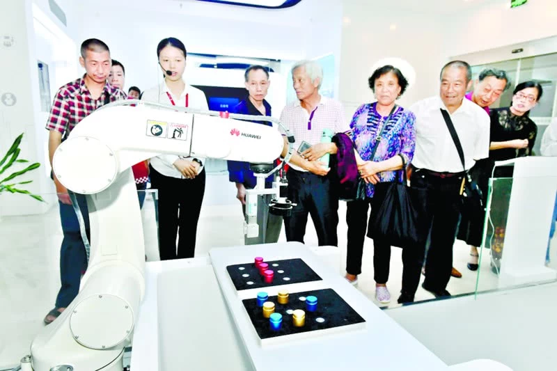 当5G 与工业生产相遇,会产生怎样的化学反应?展厅内,一个忙碌的智能机器人走走停停,吸引了探访团市民的目光。大家凑上前去仔细观察,才发现机器人正按照工作人员的指令,端着一个装满五颜六色小圆柱体的托盘,向不远处的机械臂移动。到达位置后,机器人将托盘放到机械臂下方的支架上,等待其筛选出同一颜色的圆柱体,再将托盘送回原地。整个分拣过程只用了几分钟。