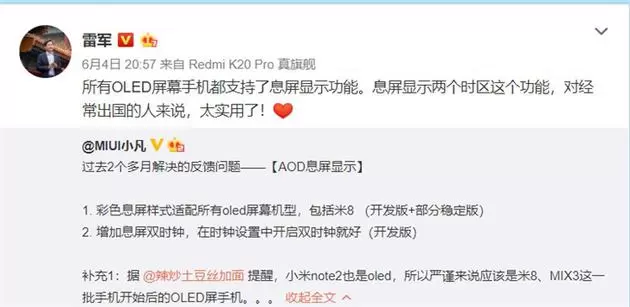 雷军:小米所有OLED屏幕手机均已支持息屏显示功能