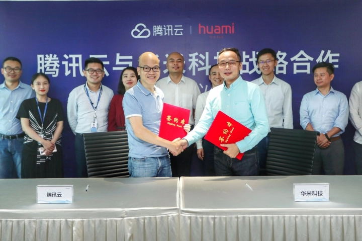 6月5日,华米科技与腾讯云、QQ音乐达成战略合作,并在位于深圳的腾讯滨海大厦举行签约仪式。华米科技全球硬件总部总裁苏伟、腾讯云智慧企业负责人蔡毅、腾讯智能平台产品副总裁赵薇等人出席,华米科技产品副总裁严纪年与腾讯云智能终端负责人傅万明共同签署了合作协议。