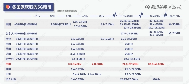 除了三大运营商获取的频谱,我国还拥有24.5-27.5GHz、37.5-42.5GHz两个频段。同时,其他国家也获取了不同的5G频段,如下图所示: