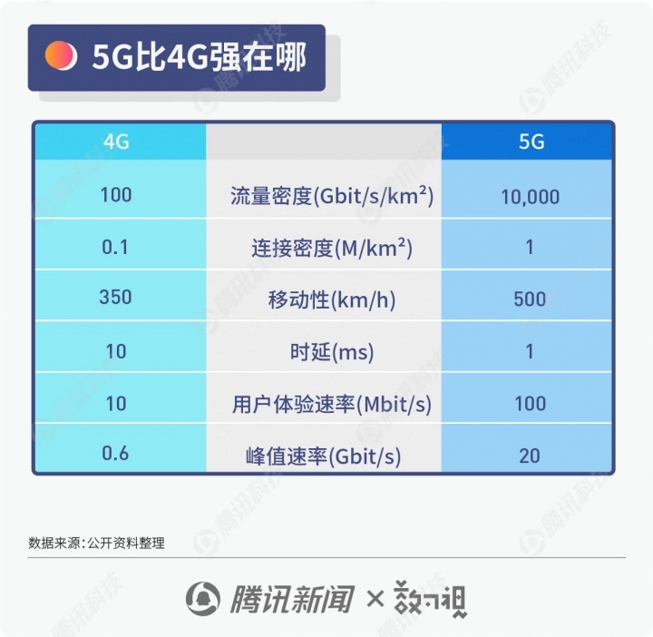 相比4G,5G的流量密度提升到原来的100倍,连接密度和用户体验提升到原来的10倍,峰值速率由原来的0.6Gbit每秒增长到20Gbit每秒,移动性由原来的每小时350千米增长到每小时500千米,时延则由10毫秒缩短到1毫秒。