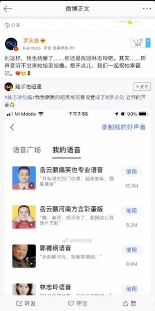 更有网友表示“已默默地把离线语音设置成了@罗永浩老师的声音”,罗永浩转发该微博劝网友想开点,并祝林志玲幸福。