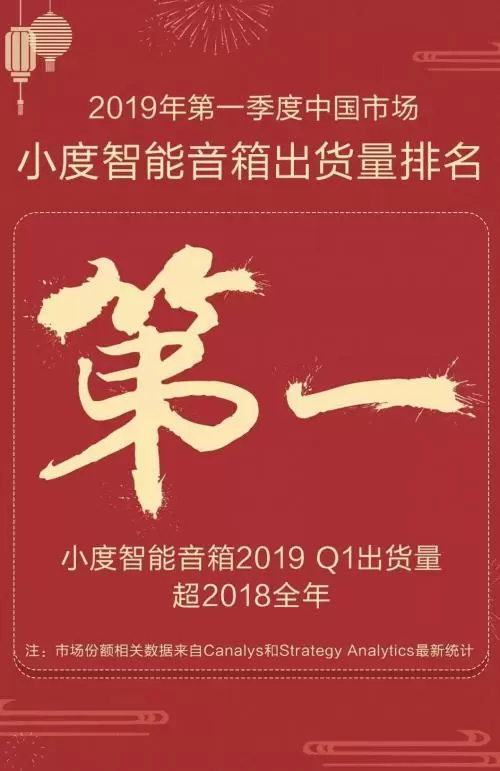 智能音箱市场易主中国,小度功不可没!据Canalys的智能音箱市场份额数据显示,2019年一季度,中国智能音箱销量达到1060万台,一举超越美国,成为全球市场主场。小度后来居上,不仅一季度斩获国内销量第一,更以强劲之姿带领中国战队牢牢占据全球智能音箱市场的半壁江山。