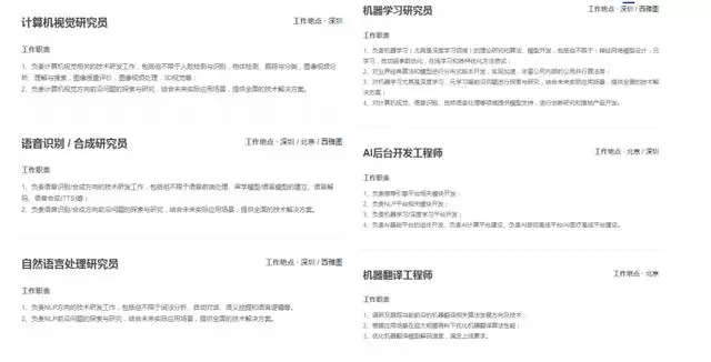 腾讯AI Lab的招聘则涉及语音识别、自然语言处理、计算机视觉、机器学习研究院等,且要求相当严苛;