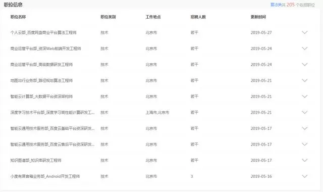 点开BAT招聘页面就可发现,百度在大数据、深度学习方面急需算法工程师以及数据分析师等,仅技术、算法和研发类的人才需求人数,就将近900人。