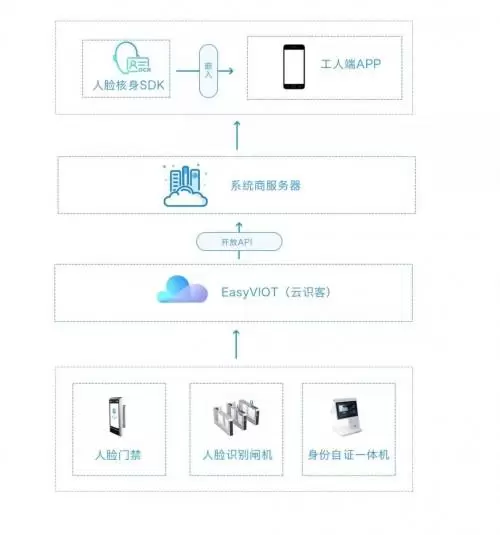 3:移动端人脸核身SDK,通过嵌入到系统商的APP中,即可实现工人实名制认证、录入人脸、真实信息等功能。