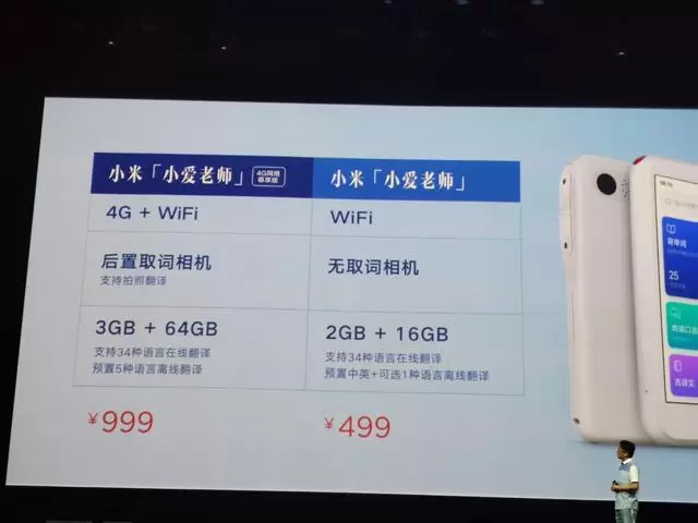 售价方面,小爱老师提供黑、白两种配色,提供3GB RAM+64GB ROM,售价999元,还有一款标准版,相比999元版本取消了4G模块和相机,存储为2GB+16GB,售价499元。