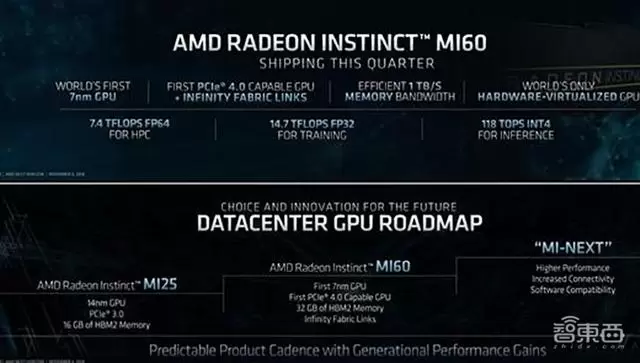 目前AMD的GPU仍然至少落后于NVIDIA的一代Tesla V100,不过在NVIDIA新招未发之时,AMD率先在其Next Horizon会议上宣布推出全球首款7nm GPU,名为Radeon Instinct MI60,内存带宽高达1 TB /秒,并声称其7nm GPU通过AMD Infinity Fabric Link等技术,成为世界上最快的双精度加速器,可以提供高达7.4 TFLOPS的浮点性能。