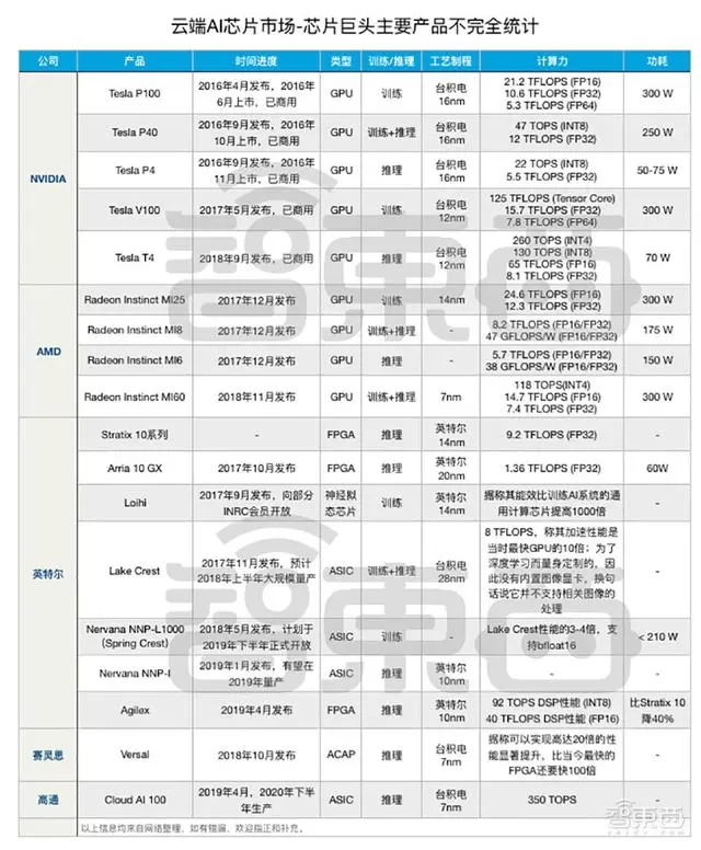 ▲芯片巨头主要云端AI芯片产品不完全统计