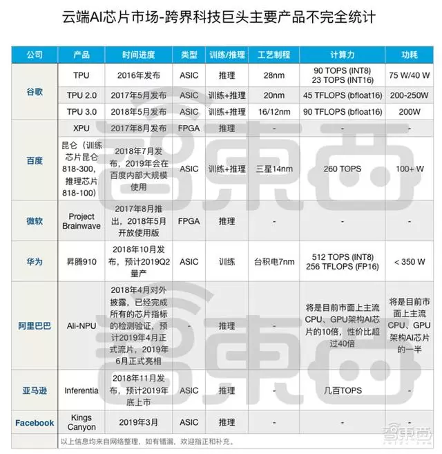 ▲跨界科技巨头主要云端AI芯片产品不完全统计