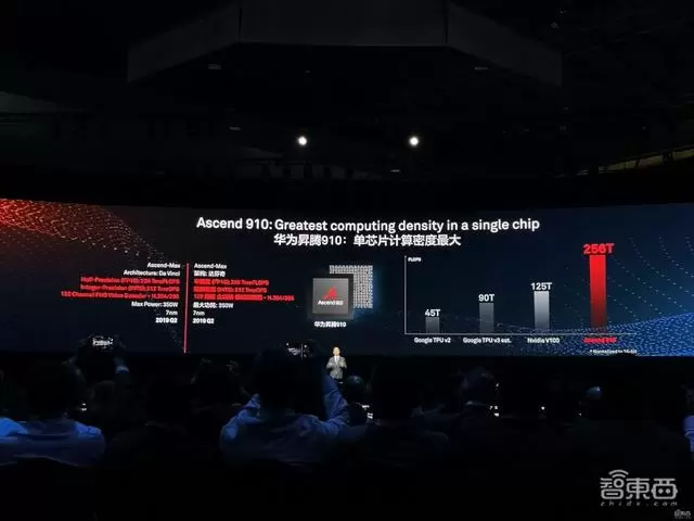 华为的云端AI芯片昇腾910更是直接在发布现场和NVIDIA与谷歌正面PK。昇腾910直接用起了最先进的7nm工艺,采用华为自研的达芬奇架构,最大功耗350W。华为打的旗号是截止到发布日期“单芯片计算密度最大的芯片”,半精度(FP16)运算能力达到256 TFLOPS,比NVIDIA V100的125 TFLOPS足足高了一倍。
