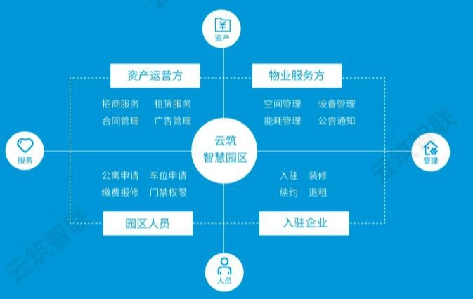 云筑·智慧园区以楼资云、蓝莓维保云等产品为基础,结合园区\写字楼客户的个性化需求,打造了面向园区资产运营方、物业服务方、入驻企业、园区人员等多角色的全面解决方案,涵盖了园区招商、园区企业管理、园区办公生活吃住行等方方面面,