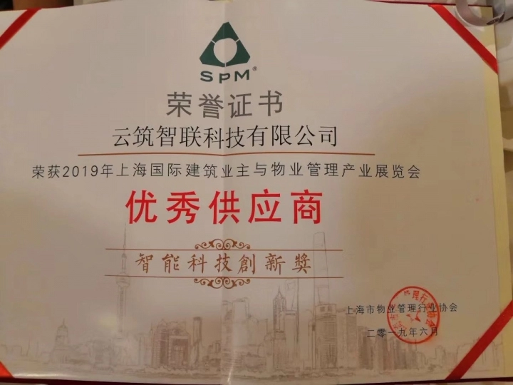 值得一提的是,本次展会上云筑智联被主办方上海市物业管理行业协会授予优秀供应商(智能科技创新奖)荣誉称号。这一荣誉称号是对云筑智联的高度肯定。