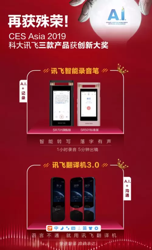 就在最近,讯飞翻译机3.0、讯飞智能录音笔SR501、讯飞智能录音笔SR701等三款新产品还斩获了2019亚洲消费电子展(CES Asia 2019)的创新大奖,代表了当届该领域内的创新趋势和产业方向。