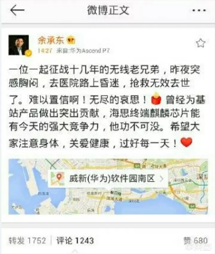 从华为高管到基层莫不是痛惜哀惋,有熟识者甚至泪如雨下。现任华为消费者业务CEO余承东抒发“无尽哀思”、前荣耀总裁刘江峰感慨“英年早逝,何其痛哉”……各大社交平台陷入一片哀恸,悼念这位英年早逝的英雄。