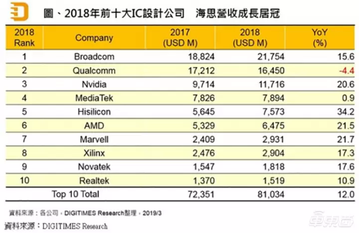 ▲2018年前十大IC设计公司(来源:DIGITIMES Research)