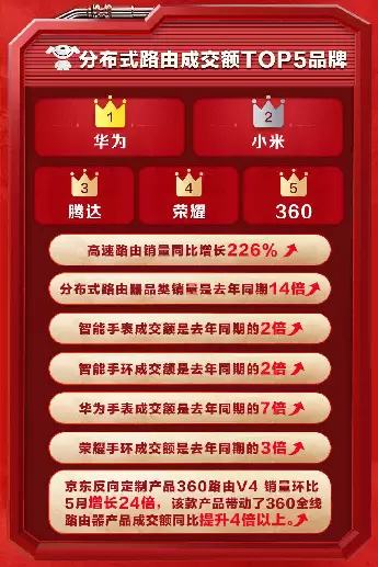 在今年京东618开门红当天,360品牌成为分布式路由成交额TOP5品牌之一。其中京东反向定制产品360路由V4 销量环比5月增长24倍,该款产品带动了360全线路由器产品成交额同比提升4倍以上。在6月13日,360成为智能家居品牌销售额排行榜中的TOP10。