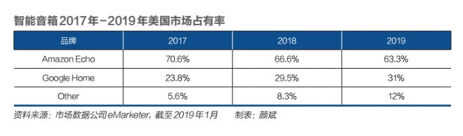 在智能语音市场上,除了发布手机之外,家庭智能硬件的竞争越来越激烈,过去主要是谷歌与亚马逊的较量。亚马逊最先行动,从2014年开始开发智能音箱,尽管技术上不如谷歌,但一直牢牢占据着过半的智能音箱市场。2016年之后,谷歌醒过来开发智能语音助手。过去三年的谷歌开发者大会,谷歌语音助手抢占了主题演讲最多的风头。