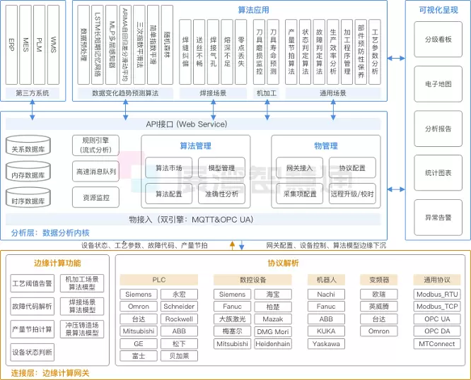 展湾智慧通是基于工业互联网架构的CPS系统,即Cyber-Physical Systems,它将实体空间中的设备以数据的形式,在赛博虚拟空间中建立模型,以建模数据为基础来实现对设备的精确管理和生产优化。在工业现场,展湾边缘计算网关采集生产数据并进行边缘计算后,将数据传输到展湾数据分析内核Data Anlytic Core(下文简称DAC)。DAC是一个搭建在云服务器上的PaaS平台,会对采集到的设备数据进行进一步处理及场景化运算,最终产出数据辅助决策,提高工艺质量及生产效率。