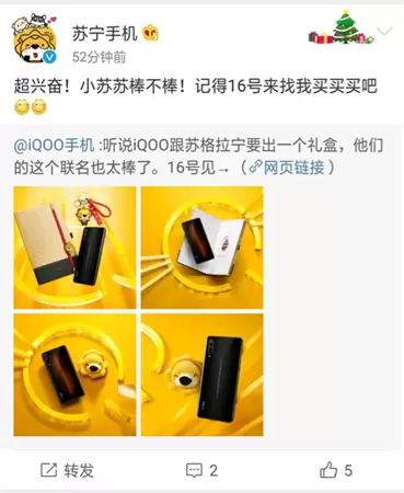 6月14日,苏宁手机和iQOO手机在官方微博上相继发布iQOO苏格拉宁联名款礼盒,并宣布在16日正式发售。目前正值618全面爆发,联名款的亮相也代表苏宁vivo的感情升温,让这场618年中大促别有一份新意。