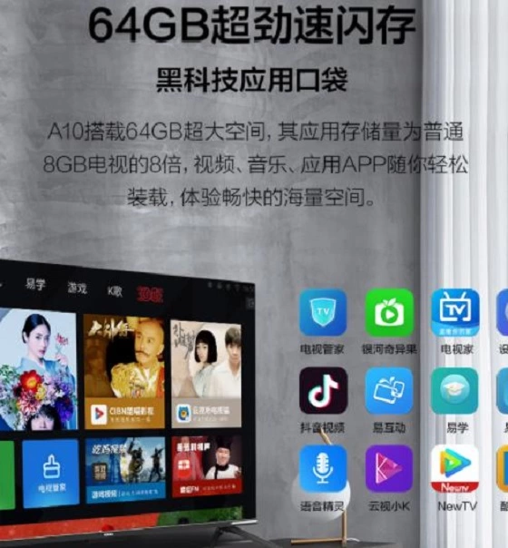 2+16GB、2+32GB的容量配置已算是市场上中高端电视的高配容量,而10系列系列具备的3+64GB容量简直超乎想象,这款电视本身就支持安装第三方应用,这64GB的豪华内存无疑就是应用百宝袋,一部电视玩转客厅的说法应该毫不夸张。