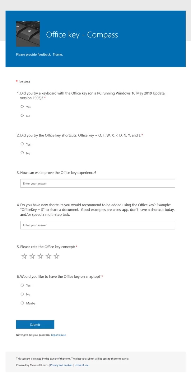 当然,微软制造了额外的键盘,但微软也在询问参与者是否希望将相同的功能配置到笔记本电脑,或者想要其他快捷方式操作,比如Office + S来共享文档。