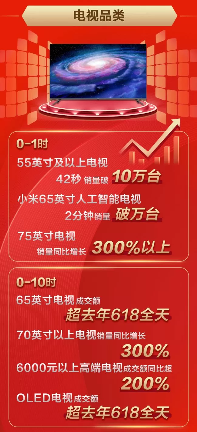 新品类的爆发,毫无疑问就是今年618京东家电带给家电行业的2019新趋势。618当天0时,无论电视、冰箱、洗衣机、空调这样的传统大家电,还是健康电器、个护电器、美容电器等生活家电,都呈现出与以往不同的消费特征。以最传统的电视品类为例,在以往“大”的基础上,消费者对“新”和“好”的追求也日益迫切。以电视品类为例,越来越低的价格和越来越大的屏幕,成为消费者选购的必然要素。18日0点起,55英寸及以上电视42秒销量即突破10万台!75英寸电视在价格跌破5500元的同时,第一个小时销量同比增长达300%以上。而在京东家电排行榜电视榜单上排名首位的小米,爆款65英寸人工智能电视2分钟销量就突破万台。当日0-10时,65英寸电视成交额超去年618全天,70英寸以上电视销量同比增长300%。6000元以上的高端电视成交额同比超200%。被看作是下一代电视技术标配的OLED电视,到上午10点成交额已经超去年618全天。
