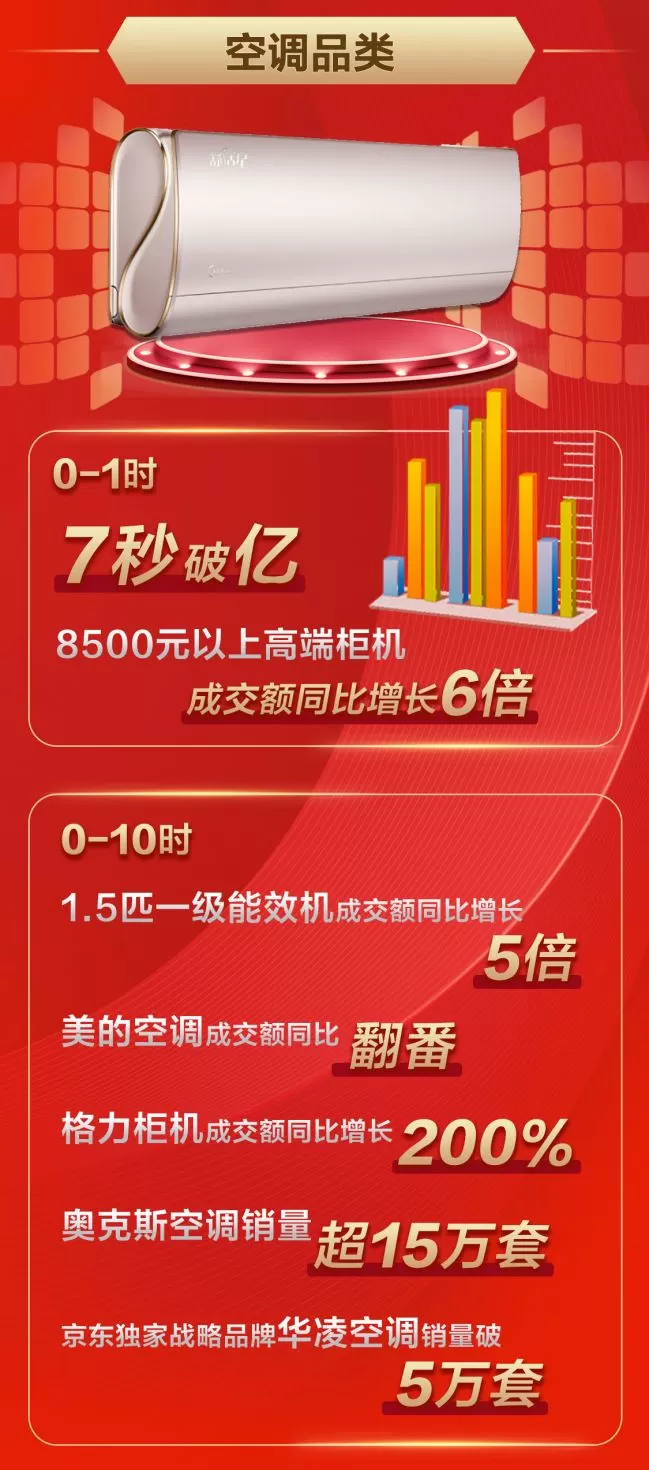 消费者对空调的能耗也相当重视,1.5匹一级能效空调1分钟销量就超过5万台,8500元以上的高端柜机在第一个小时成交额同比就增长了6倍。截至上午10点,1.5匹一级能效机成交额同比增长5倍。空调截至上午10点,45个单品破千万成交额,自动清洁空调成交额同比增长300%,新功能成为人们的优选。无风感、0风感、柔风技术等空调销售火爆,10个小时成交额均超过5月全月总和。