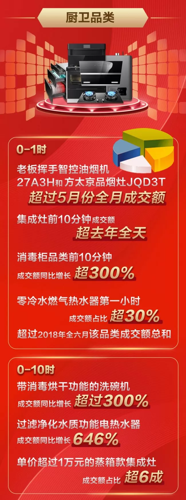 小家电从来都是家电消费升级的“主力军”。今年618也不例外,高品质、新功能成为备受消费者关注的“热词”。电压力锅前1小时销量突破20万台,冷风扇品类前1小时销量已经超过去年全天。厨卫电器同样显示出新兴品类的“实力”,消毒柜前10分钟成交额同比增长超300%,集成灶前10分钟成交额就已经超过去年全天,而“零冷水”燃气热水器在第一个小时成交额占比超过30%,比2018年整个六月该品类的成交额总和都要多。截至凌晨1时,老板挥手智控油烟机27A3H和方太京品烟灶JQD3T,已经超过5月份全月成交额。