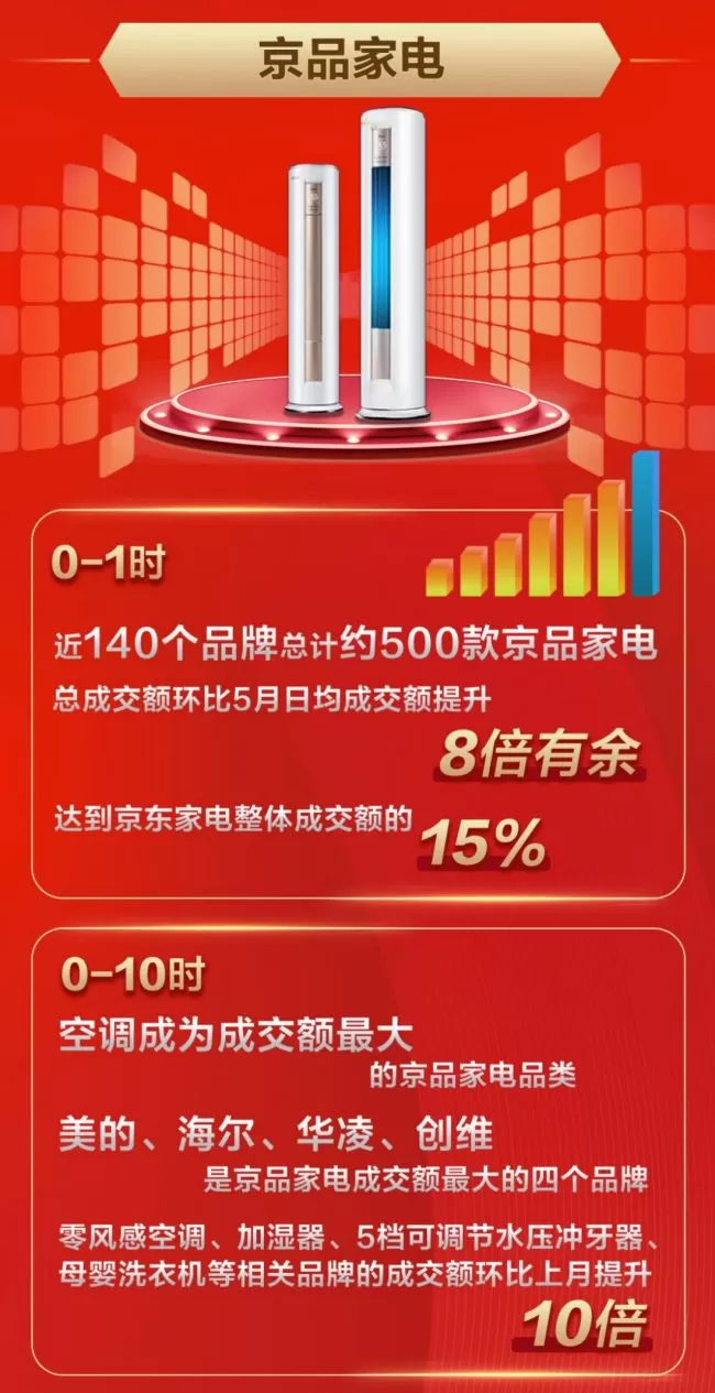 尽管爆品如云,然而最受消费者追捧的无疑是高品质个性化定制的京品家电。18日0时起仅1小时,近140个品牌总计约500款京品家电疯狂热卖,总成交额环比5月日均成交额提升了足足8倍有余,达到京东家电整体成交额的15%,创下历史新高。截至上午10点,空调成为成交额最大的京品家电品类,美的、海尔、华凌、创维则是京品家电成交额最大的四个品牌。此外,根据京东家电销售大数据显示,京品家电用心打造的空调零风感、加湿器的除菌与便捷上加水功能、冲牙器5档可调节水压功能、洗衣机母婴洗细分功能都深受广大消费者青睐,相关品牌的成交额环比上月提升10倍。